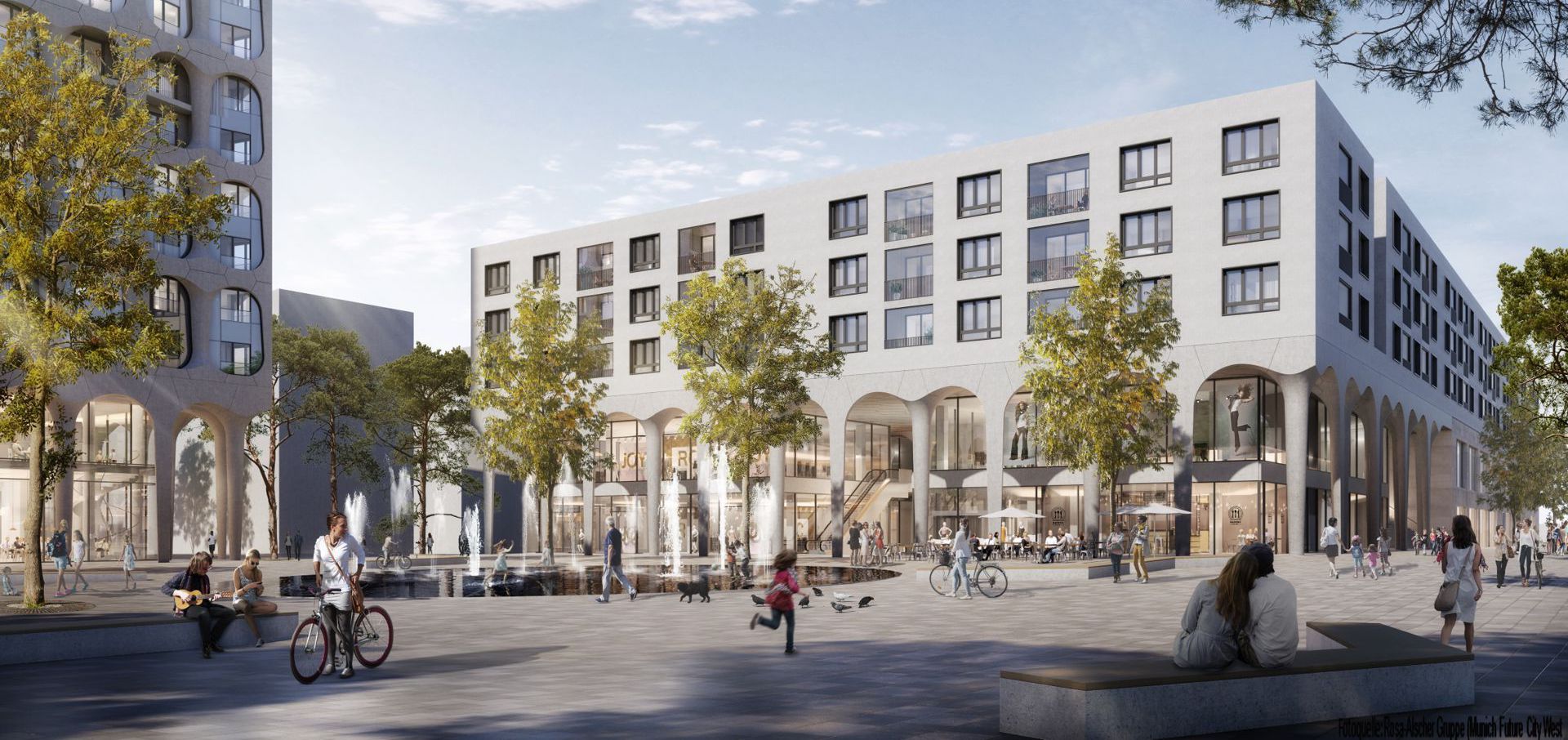 München, Neuhausen LEON11 Moderne Architektur mit Natursteinoptik, großen Fenstern, sonnigen Balkonen und durchdachten Details – stilvoll und harmonisch ins Umfeld eingebettet. 17.000 m² Gesamtfläche 200 Wohnungen mit Parkplätzen